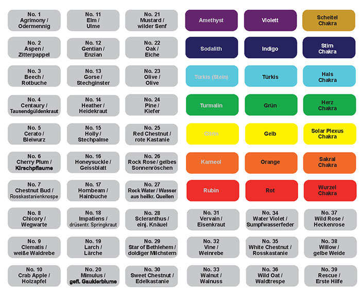 In unserem Testkasten „Bachblüten“ sind die energetischen Informationen der englischen, aber auch der schweizerischen und deutschen Bachblüten zusammengefasst. Die Farben und die Chakren sind außerdem selbstverständlich enthalten.